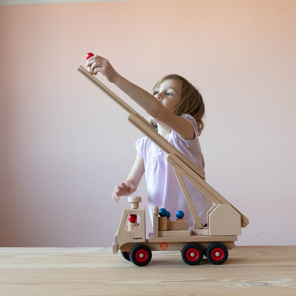 Mit einer Leiter, die jede noch so hohe Herausforderung bewältigen kann, und einem 6-köpfigen Feuerwehr-Team, dass bei jedem Einsatz zusammenhält. Durch den typischen Drehknopf am Dach des Fahrzeuges kann jeder Einsatzort präzise angefahren werden und zukünftige Feuerwehrfrauen und -männer können ihre Leidenschaft im freien Spiel ausleben.