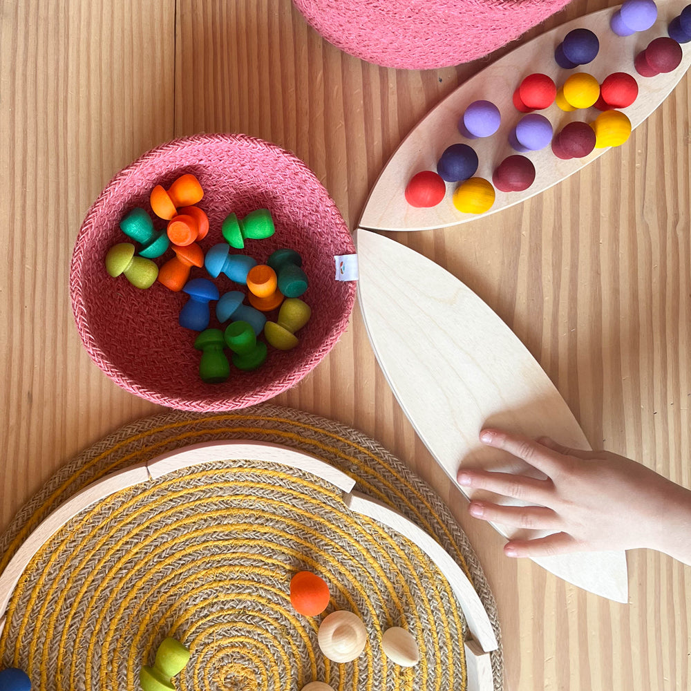 Und natürlich lassen sich mit diesen „Petal Platforms“- wie Grapat sie benannt hat auch wunderbare Mandals legen. Besonders wenn ich mit älteren Kindern oder Erwachsenen arbeite, beobachte ich, dass die Holzplatten meist verwendet werden, um damit ganze Landschaften zu bauen - geschmückt in den herrlichsten Farben, mit buntem Mandala-Material von Grapat oder mit Schätzen aus der Natur. Jede Platte für sich wird zu einer kleinen Insel und in Summe entstehen dann die wunderschönsten Kunstwerke. Es bereitet mir immer wieder große Freude zu beobachten, wie sich die Spielenden ganz in dieses Material vertiefen können.