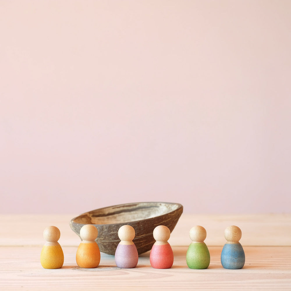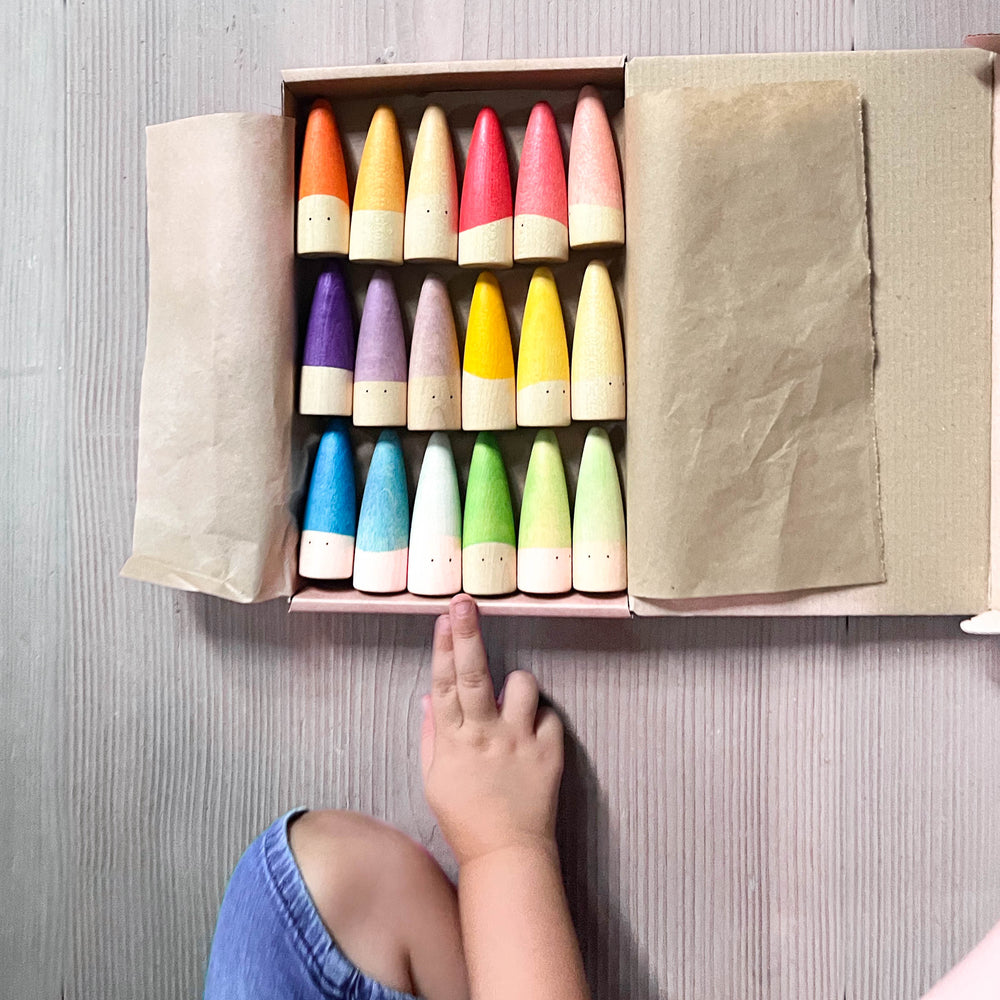 Die bunten Stapelbecher sind große Farbwunder. Die Größten der Becher sind kräftig bunt in strahlenden Farben des Regenbogens - und auch schon für junge Kinder gut geeignet. Und dann, „Schicht für Schicht“ werden die Holzbecher heller, zarter, fast transparent. Ein wunderbares Material für einen Stapelturm, zum Sortieren, Aufbewahren, um damit Kunstwerke zu gestalten, um Farbwelten zu benennen und um mit all den feinen Schattierungen zu experimentieren.