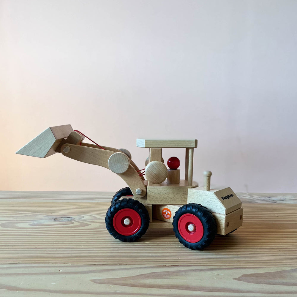 Der Radlader von Fagus lässt sich leicht lenken und seine Schaufel ist durch ein Seil stufenlos verstellbar. Durch seine vielfältigen Möglichkeiten begeistert er vor allem Kinder, die schon komplexere Vorhaben umsetzen wollen und bereits Fuhrpark-Erfahrungen besitzen. So kann die große Baustellenliebe auch zu Hause einen Platz erhalten – und im freien Spiel verwirklicht werden.