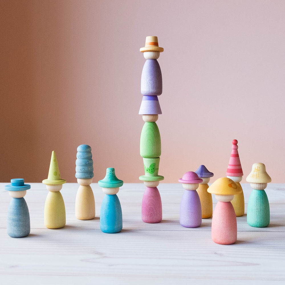 Dürfen wir vorstellen? Diese entzückenden Spielfiguren aus Holz sind die 12 bunten Nins mit 12 abnehmbaren, von Hand verzierten Hüten von Grapat. Jeder bereit seinen Hut vor dem Anderen zu ziehen, Farbe zu wechseln, Kopfstände zu machen. Ein wunderschönes Material, um nach Lust und Laune wählen zu können. Um Farben zuzuordnen, Formen zu benennen, Eigenschaften zu definieren und um eine Fantasiewelt entstehen zu lassen, in der diese kleinen Geschöpfe Freude machen. Der Großteil der Hüte lässt sich auch ganz wunderbar kreiseln und man würde es nicht für möglich halten, dass die Hüte perfekt in die Hengstenberg-Hocker passen - wobei ich zugeben muss, dass diese Entdeckung von einem ganz jungen Forscher gemacht wurde :-)