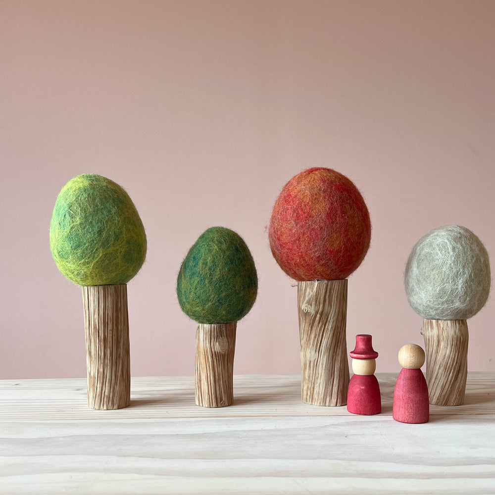 Im Set erhältlich – jedenfalls eine perfekte Ergänzung für große und kleine Spielwelten oder den Jahreszeitentisch. Übrigens: das Set gibt es auch "verkehrt herum", also der hellgrüne Baum klein, der dunkelgrüne groß usw..., heißt dann Filzbäume Vier Jahreszeiten Set 2.