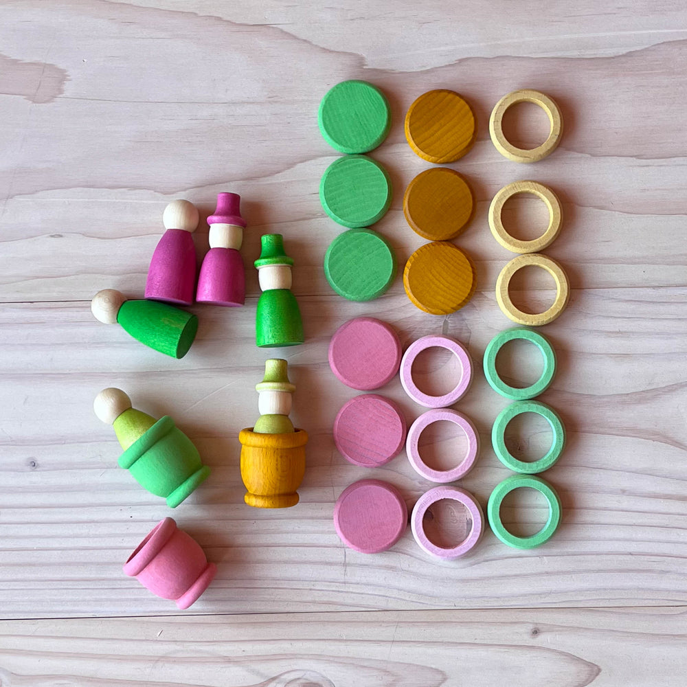 Eine wunderschöne, freundliche Farbwelt für alle Freunde des freien Spiels: 3 Freunde ohne Hut und 3 Freunde mit Zauberhut – oder vielleicht Sonnenhut – 3 Töpfchen, 18 Ringe und 18 Plättchen. Willkommen, ihr zauberhaften Wesen.