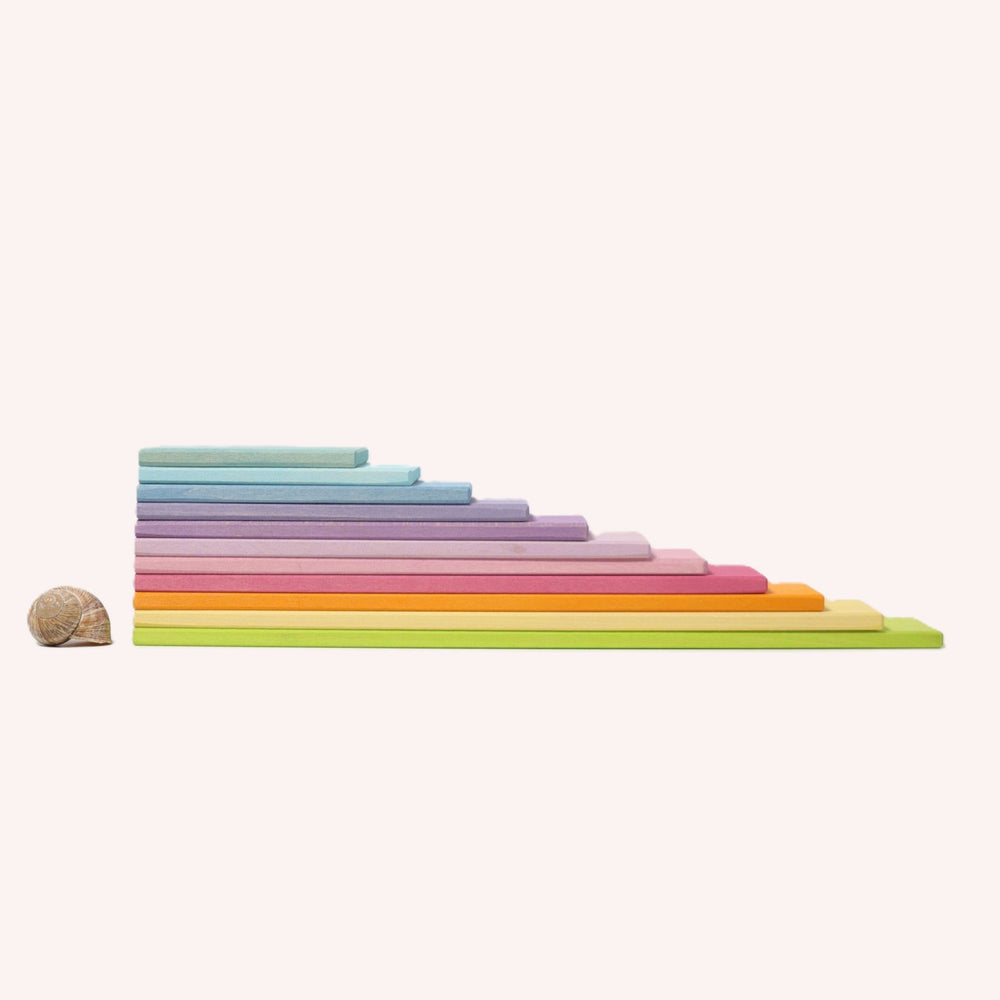 Dieses 11-teilige Set aus Bauplatten in Regenbogenfarben ist eine wunderbare Ergänzung zu den Pastell Halbkreis Platten von Grimms. Gemeinsam mit ihnen und vielleicht auch dem Grimms Regenbogen lassen sich wunderbare Welten erschaffen und neue Baumöglichkeiten die dem freien Spiel keine Grenzen setzen!