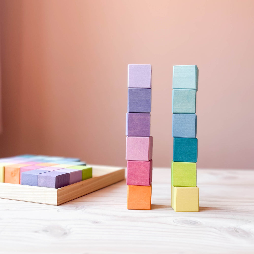 Das Pastell-Mosaik von Grimms besteht aus 36 zart lasierten Lindenholz-Würfeln. In 12 Farben, die einander so sanft und doch wirkungsvoll ergänzen, dass jedes Muster, jedes Bauwerk oder jede Welt, die im freien Spiel entsteht, eine Einladung an die Sinne ausspricht.