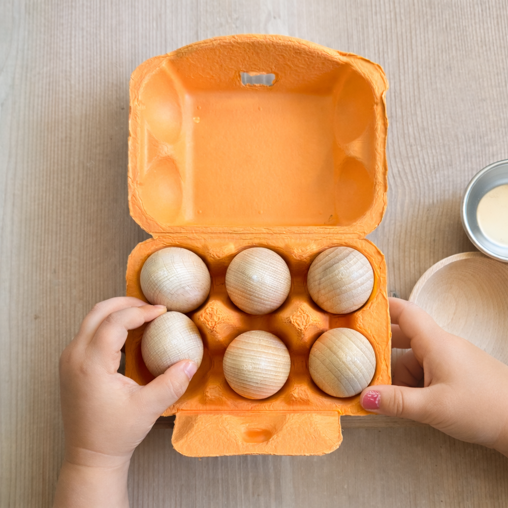 Keep it simple, but beautiful. 6 Holzeier im Eierkarton - je nach Lust und Laune - in orange, rosa oder zartem violett. Unsere Holzeier werden in Österreich aus Buchenholz gefertigt, weisen teilweise unterschiedliche Maserung auf und sind unbehandelt. Perfekt für den Einsatz in der Puppenküche.