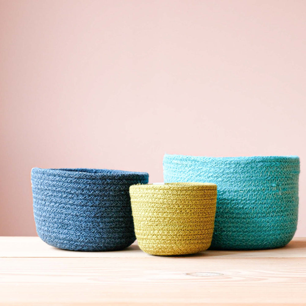 Die 3 farblich unterschiedlichen Juteschalen in 3 Größen eigenen sich wunderbar, um kleine Dinge groß zur Geltung kommen zu lassen. Holzeier, Holzringe, ein buntes Auto, einen Häkelball, oder einen Baustein…Die Farben sind ansprechend schön und laden auch dazu ein, Gegenstände farblich zu sortieren. Das macht Freude.