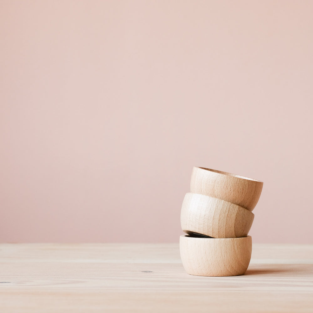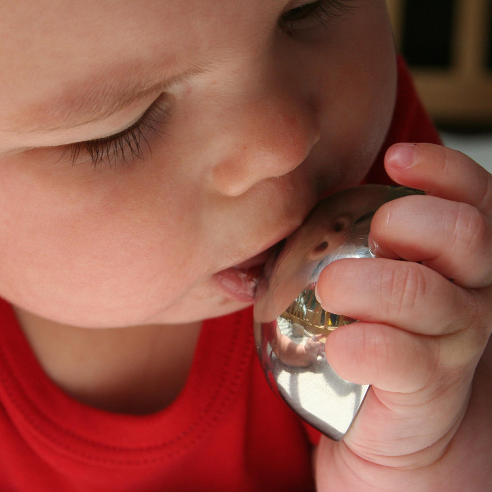 Das ganz junge Kind ist interessiert an diesen kühlen, glatten Schüsselchen aus Edelstahl. Ganz zufällig entsteht ein herrlicher, freundlicher Klang, wenn die Schüsselchen aneinander stoßen. Das spielende Kind kann sich in dieser spiegelnden, gebogenen Oberfläche erkennen und durch das vielfältige Hantieren des Kindes, verändert sich das Spiegelbild jedes Mal aufs Neue.