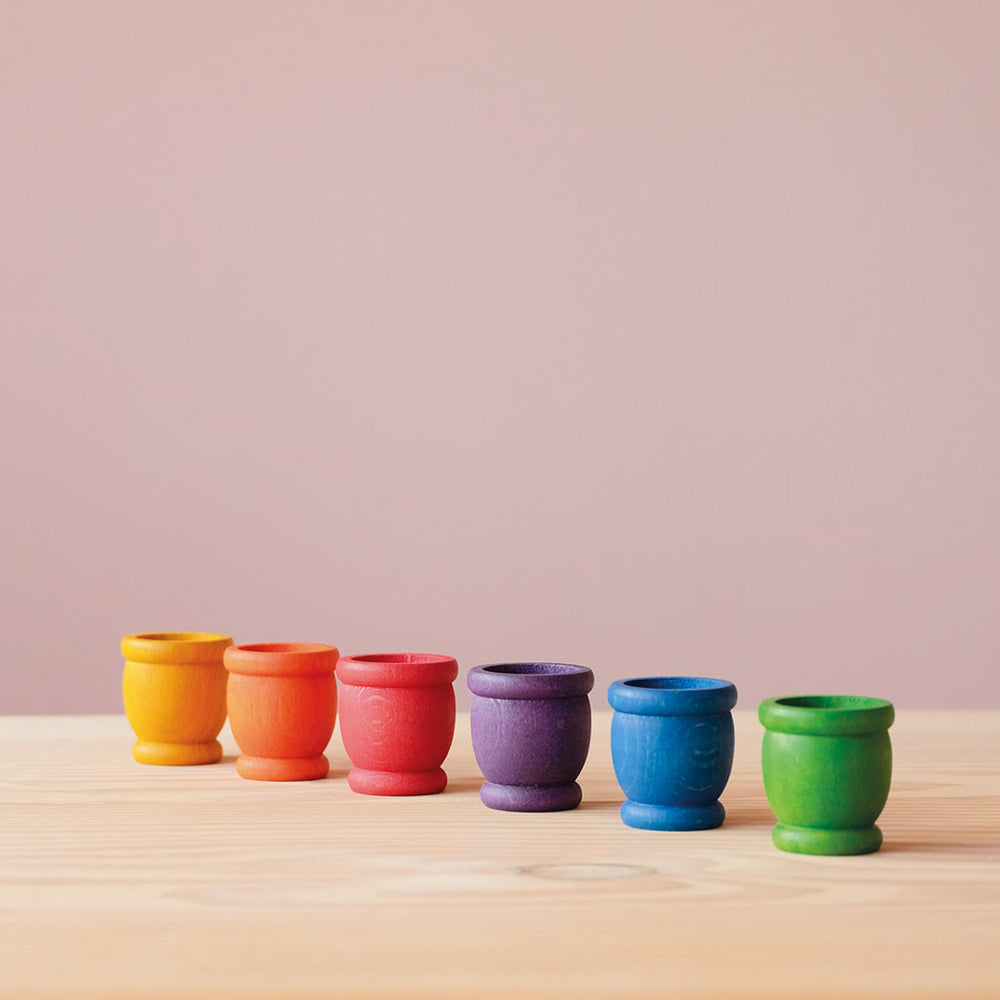 6 Freunde in den Farben des Regenbogens. Und zu jedem Freund gibt es 6 farblich passende Ringe und 3 farblich passende Plättchen. Die Ringe lassen sich gut über den Freund stapeln und so kann er Ring für Ring immer mehr zugedeckt werden, bis er ganz verschwunden ist.