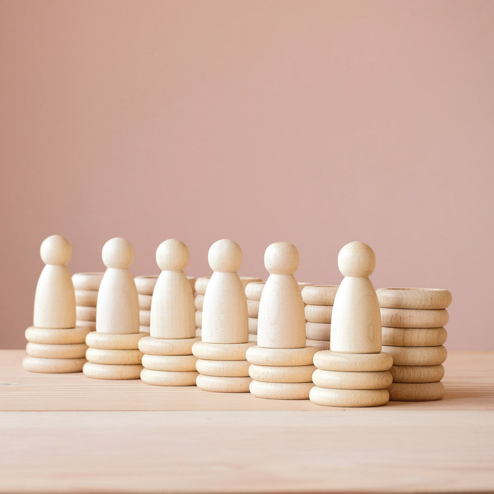 6 Freunde aus naturfarbenem, hellem Birkenholz, 18 geschmeidige, glatte Plättchen und 36 Ringe. Phantasie, was willst du mehr!