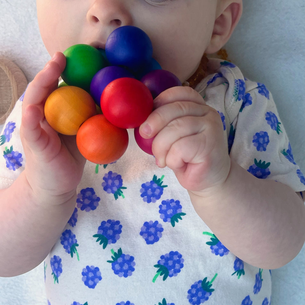 In den Farben des Regenbogens bunt lasierte Holzkugeln, verbunden mit einem Gummiband.