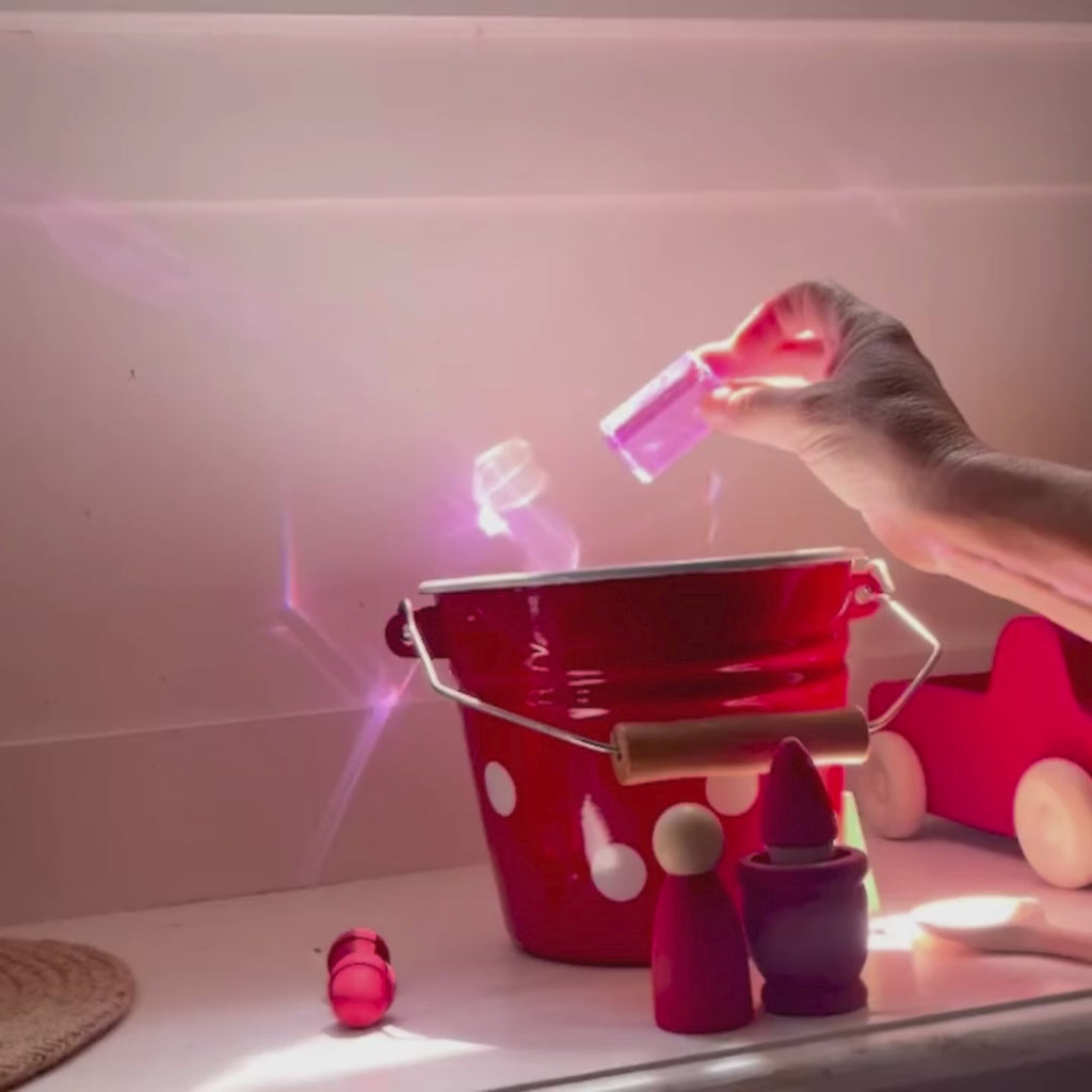 24 längliche Bausteine in Quaderform aus transparentem, buntem, unzerbrechlichem Acrylglas - in leuchtenden Regenbogenfarben. Die farbige Transparenz finden Kinder aus meiner Beobachtung immer wieder ganz besonders faszinierend. Farbliches Zuordnen zu anderen Gegenständen wirkt besonders spannend und wenn der oder die Spielende entdeckt, welch zauberhafte Welt sich durch den Einfall eines Lichtstrahls auf den Quader ergibt, dann ist die Faszination besonders groß. Ein wunderbarer Einstieg in ein lichtvolles, farbenfrohes Bauen.