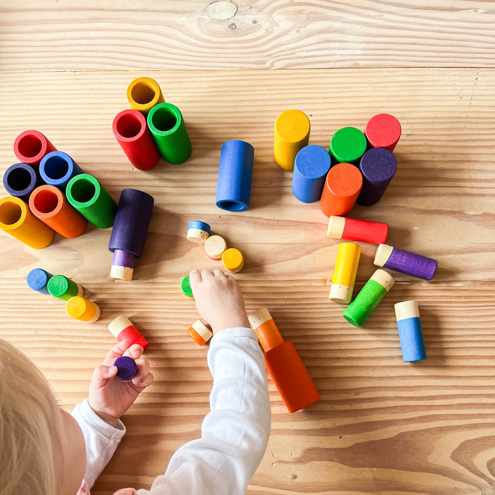 6 bunte Säulen, 6 bunte Becher, 6 bunte Röhren und 18 verschieden kleine und große Lolas, die sich darin verstecken können, wenn sie wollen. Ein wunderbar buntes, rundes Material fürs erste Stecken des jungen Kindes (in diesem Fall solltest du nur die größten Lolas anbieten), zum Sortieren, Rollen, Sammeln, Stapeln – oder einfach nur um Lolas Gesicht zu entdecken. Immer wieder bringt erfreut es mich, wenn ich Kinder, die schon lange zur Schule gehen, ganz vertieft im Spiel mit den Lolas beobachte.
