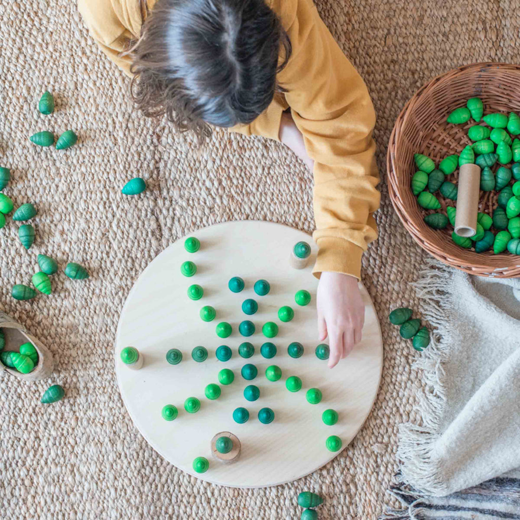 Die große, runde Holzplatte heißt bei Grapat “Konstruktions Plattform” und das beschreibt sie wohl am treffendsten. Sie eignet sich hervorragend als “Boden” um darauf Bauwerke zu errichten oder um sie als tragenden Bestandteil in ein Bauwerk zu integrieren. Auf ihr können Mandalas gelegt werden oder kleine Spiellandschaften entstehen. Sie bietet dann auch die Möglichkeit, diese Bauwerke an einem geschützten Platz in Sicherheit zu bringen.