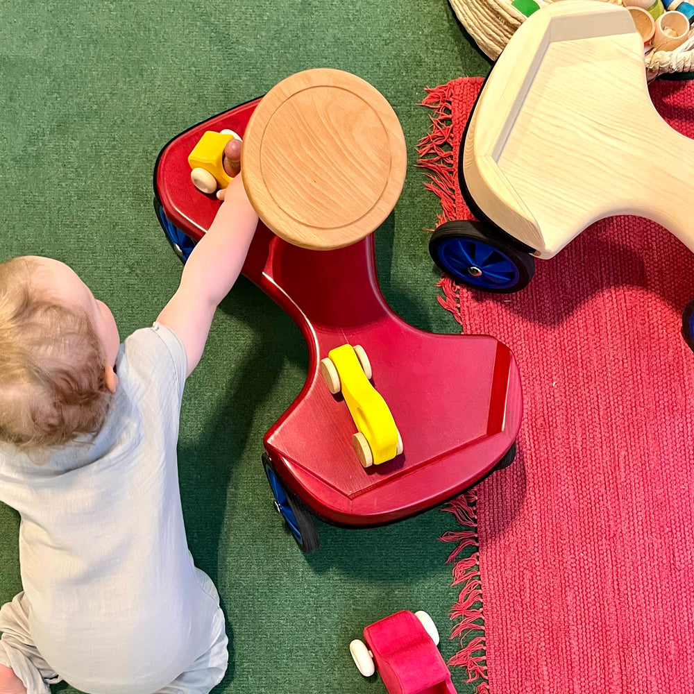 Das rote Rutschauto wird aus heimischem Fichtenholz gefertigt, wird im Zuge des Herstellungsprozesses samtig weich geschliffen und hat eine „eingebaute“ Stoßstange aus schwarzem Filz vorne und hinten. So werden die Möbel und Türstöcke zuhause geschont. Die Lenkung erfolgt bei diesem Zimmer-Flitzer mithilfe eines Zugseils, schon Kinder ab 1 Jahr sind somit schon ganz einfach mobil.