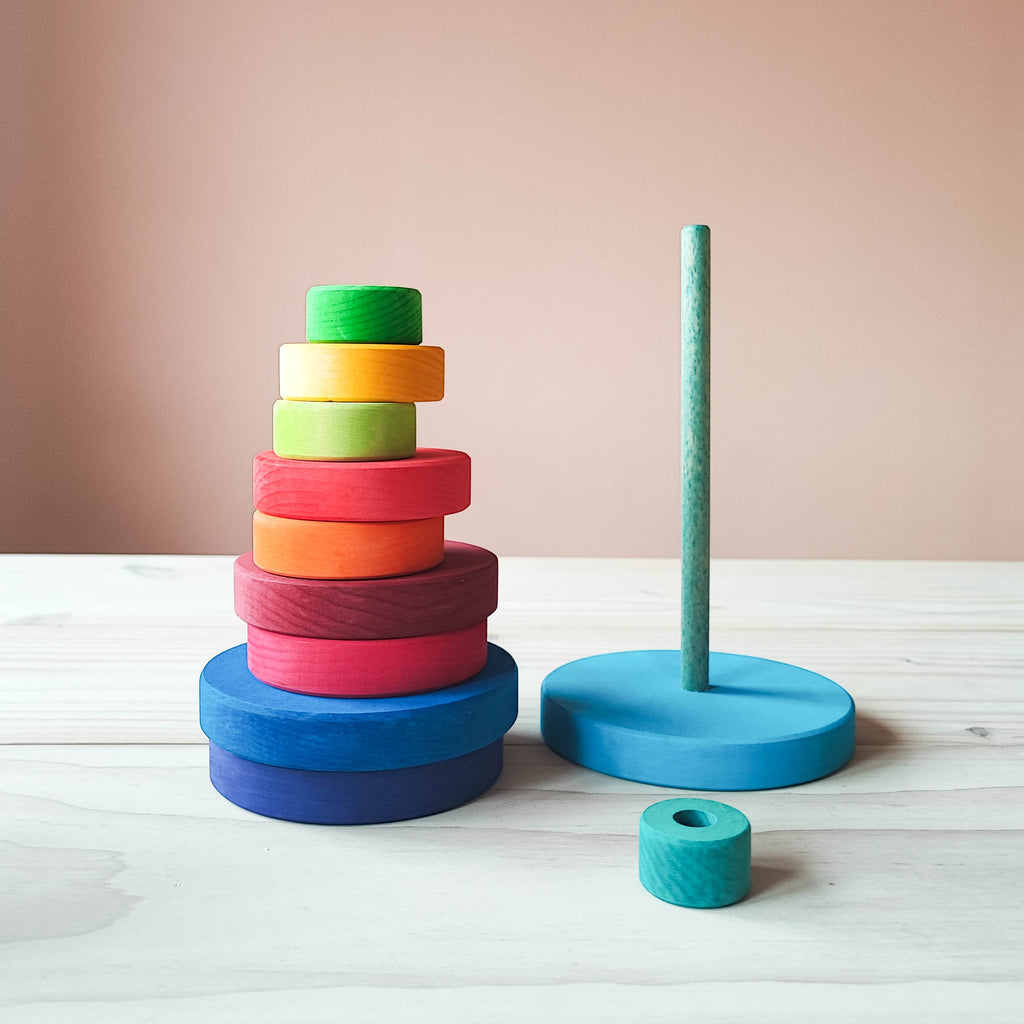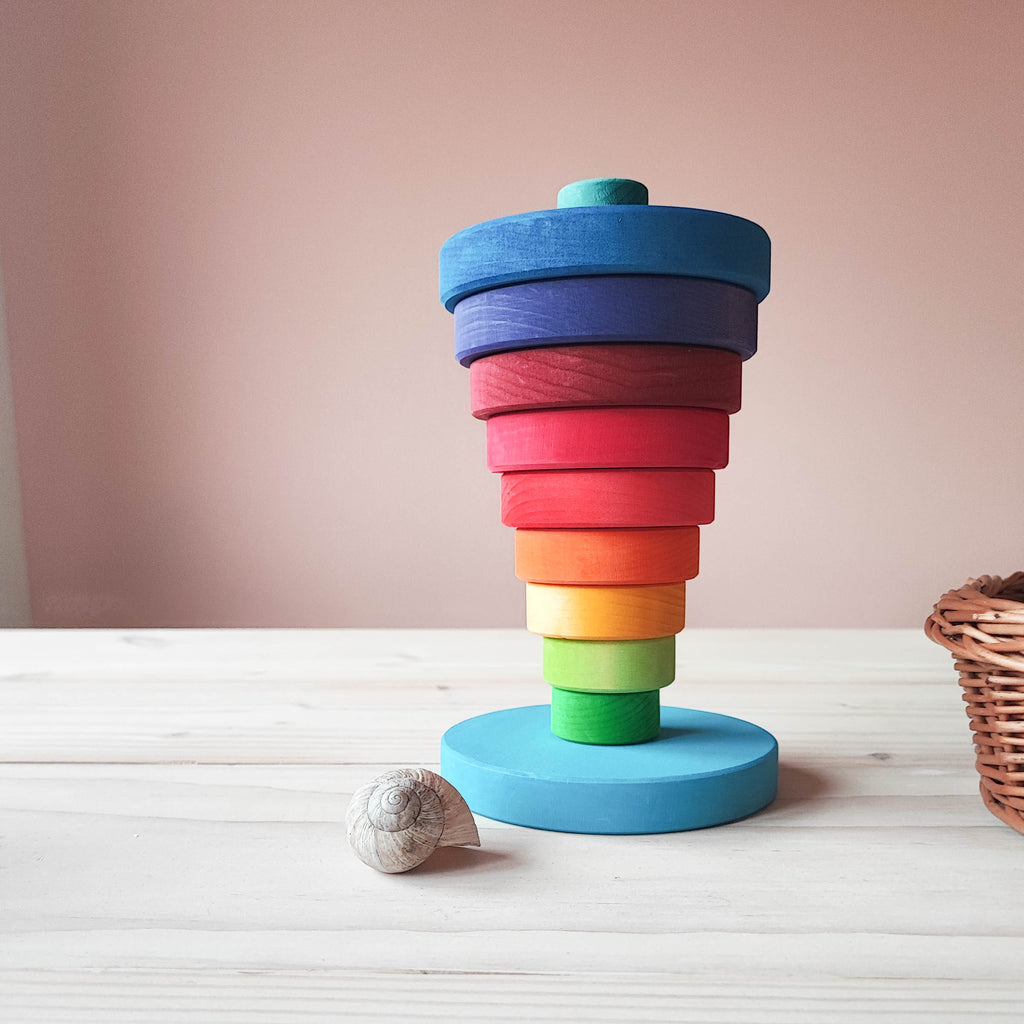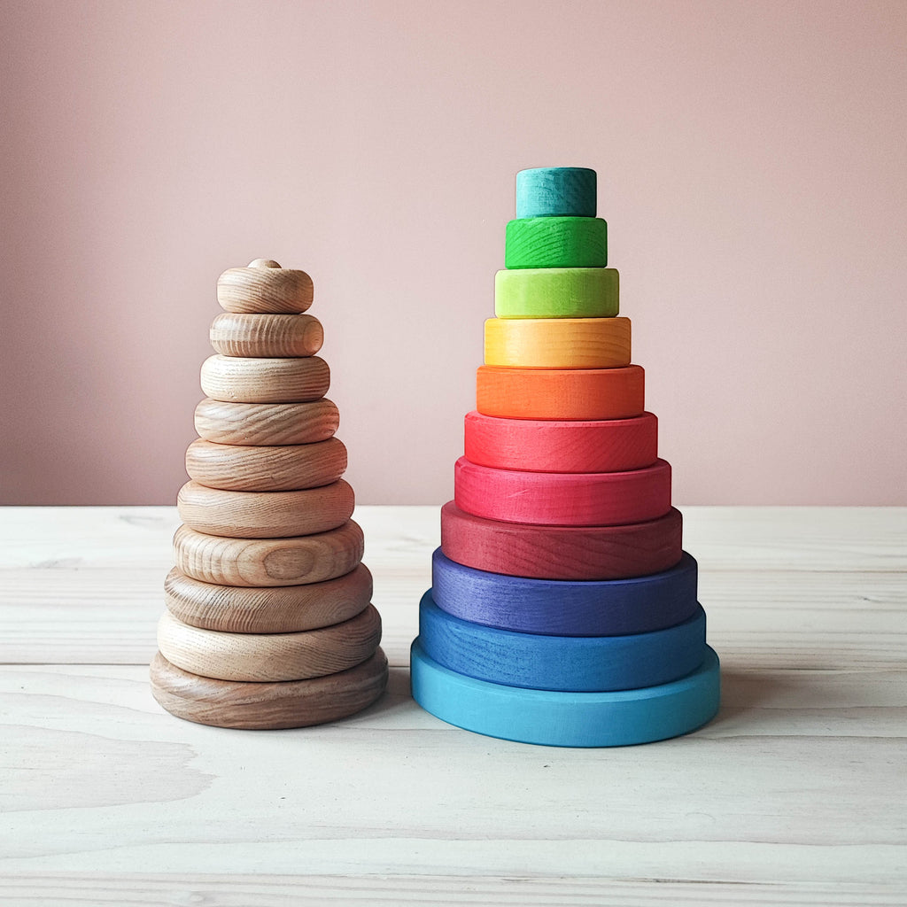 Abgeleitet von der Waldorf Pädagogik lädt der Grimms Stapelturm zum Erleben von Farbe und Form ein. Es geht nicht um das schnelle Ergebnis, sondern darum, dass das Kind erlebt, wie sich Farben begegnen, beispielsweise wie sich Rot zu Gelb verhält, wie Blau beruhigt oder wie Grün sanft ausgleicht.