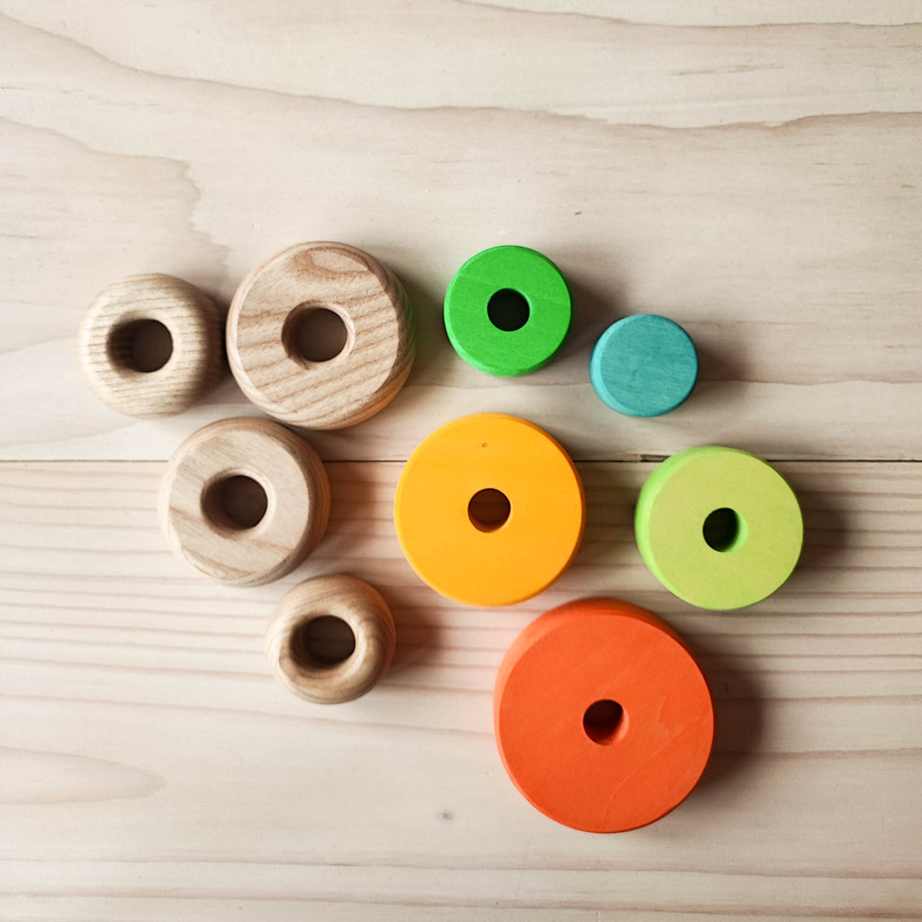 Bereits ab 12 Monaten ist der Scheibenturm möglicherweise interessant. Er steht bereit und wenn das junge Kind interessiert an Greifen, Stecken, Sortieren und Balancieren ist, wird es den Turm freudig als Spielmaterial entdecken, ganz im Sinne von Emmi Pikler. Und ein bisschen später dann werden die einzelnen Scheiben als Baustein verwendet oder in der Puppenküche, so ist eins sicher, dieser Turm begleitet euch über viele Jahre.-less-