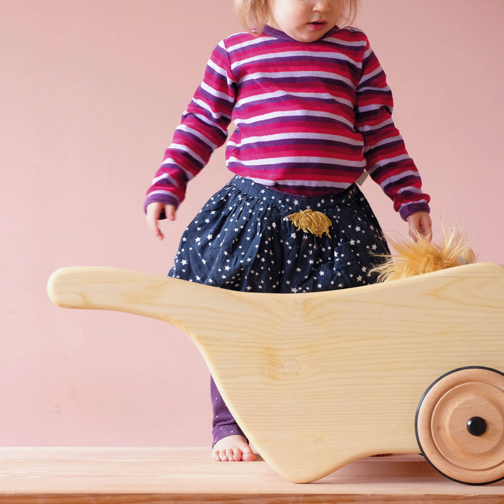 Bausteine einfüllen und Dosen, Ringe und all den „Müll“. Wer und was passt alles in diese Scheibtruhe hinein? Sie steht so sicher, dass das junge Kind gerne auch mal versucht, ob es drinnen Platz finden kann. Und vielleicht die Erkenntnis machen kann, dass die Scheibtruhe sich fast nicht bewegen lässt, wenn ein anderes Kind drinnen sitzt. Ein absolut perfektes, robustes, einladendes (im wahrsten Sinne des Wortes) Teil für Kinder – so ca. ab 2 Jahren.