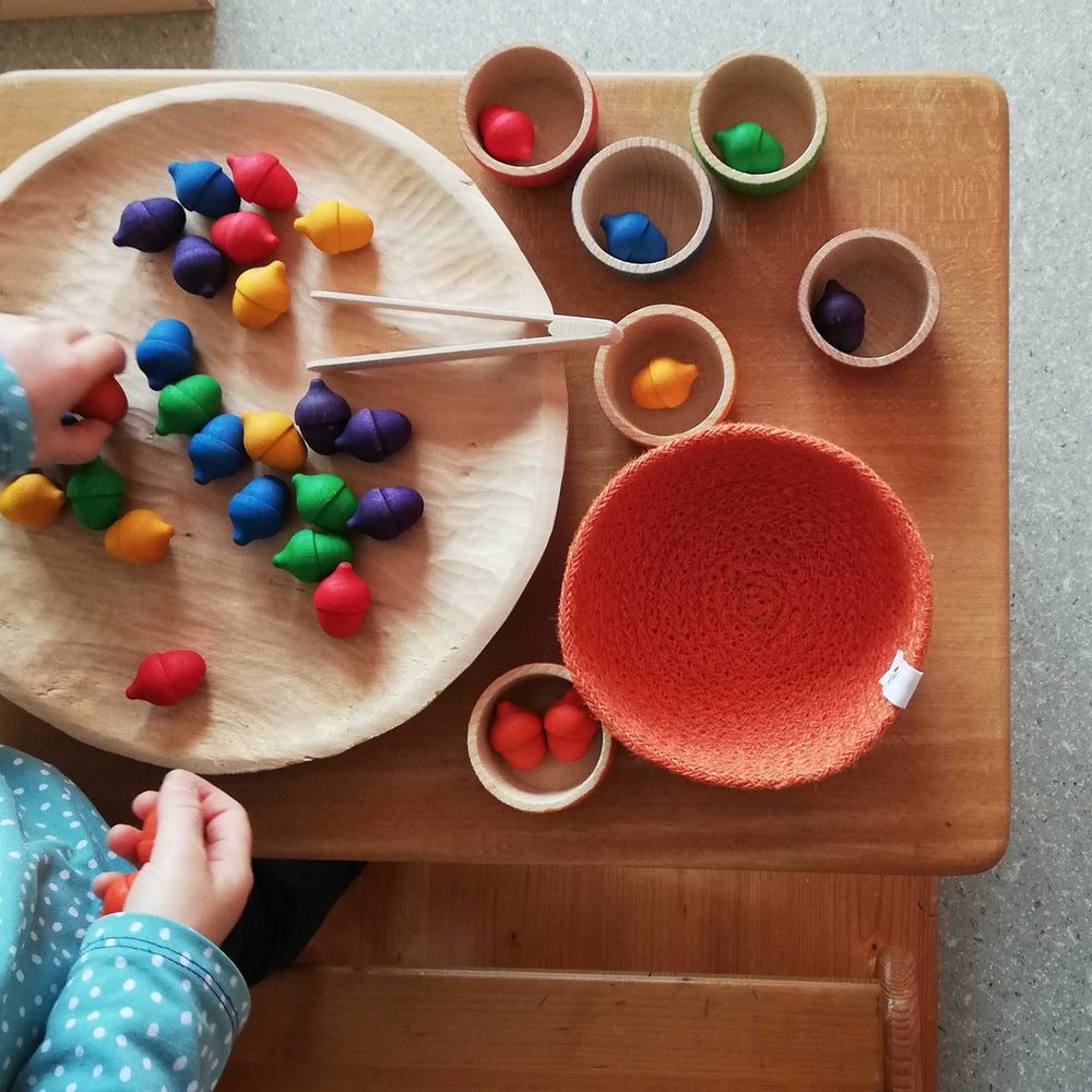 6 Schälchen in 6 verschiedenen Farben, je 6 Eicheln und eine Holzzange – mehr braucht es nicht, um langanhaltend beschäftigt zu sein. Intuitiv kannst Du das Material nach Farbe sortieren. Zuerst vielleicht mit der Hand? Und dann mit der Holzzange? Echte Zufriedenheit kannst Du spüren, wenn alle Eicheln ihren Platz gefunden haben. Und wenn Du genug sortiert hast, dann bereiten die zarten Früchte auch Freude in der (Kinder-)Küche. Dieses besondere Spiel von GRAPAT ist aus Holz aus nachhaltiger Forstwirtschaft gefertigt und kommt plastikfrei in Dein Spielzimmer.