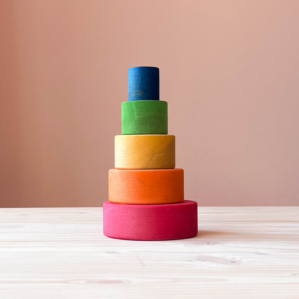Die Stapelbecher in 5 kräftigen Farben werden aus heimischem Erlenholz von Hand gefertigt und mit schadstofffreier Lasur behandelt. Die Schälchen eignen sich als schlichtes, formschönes, sinnliches Material zum Begreifen, zum Stapeln, zum Bauen, Sortieren und Farben benennen. Was versteckt sich wohl unter dem großen roten Schälchen? Was passt in das ganz kleine Blaue hinein?