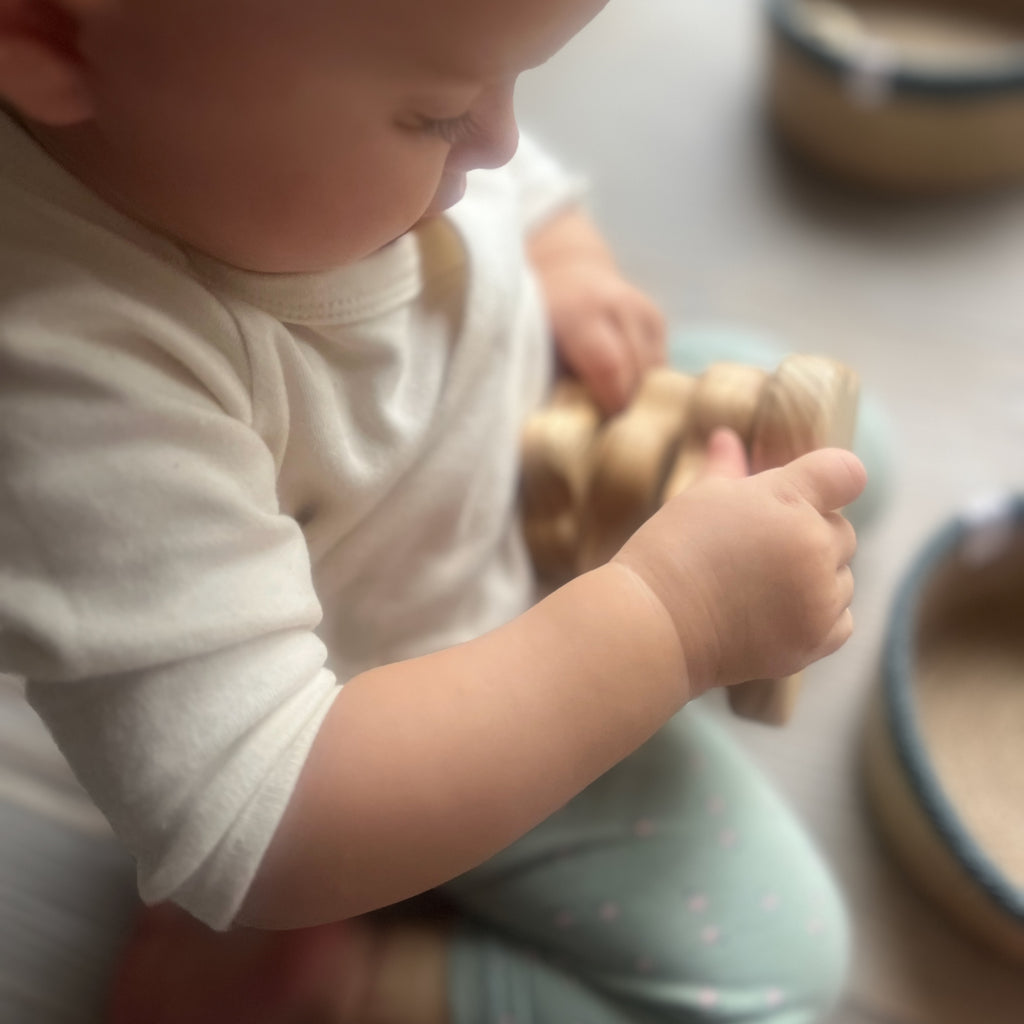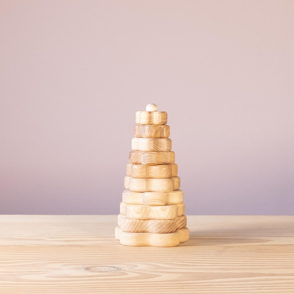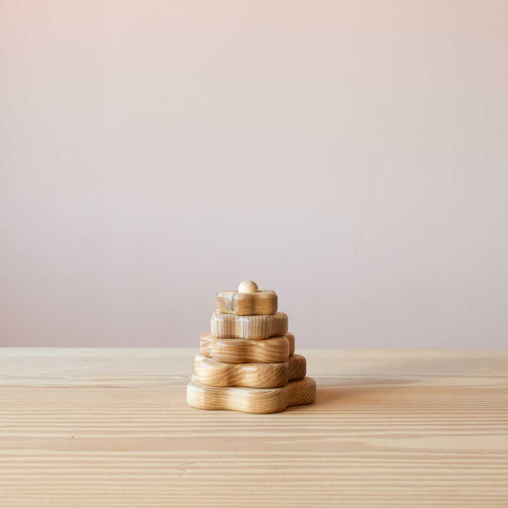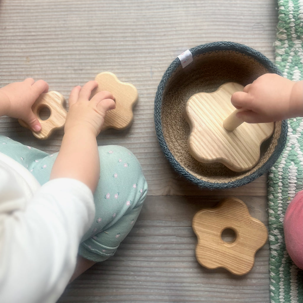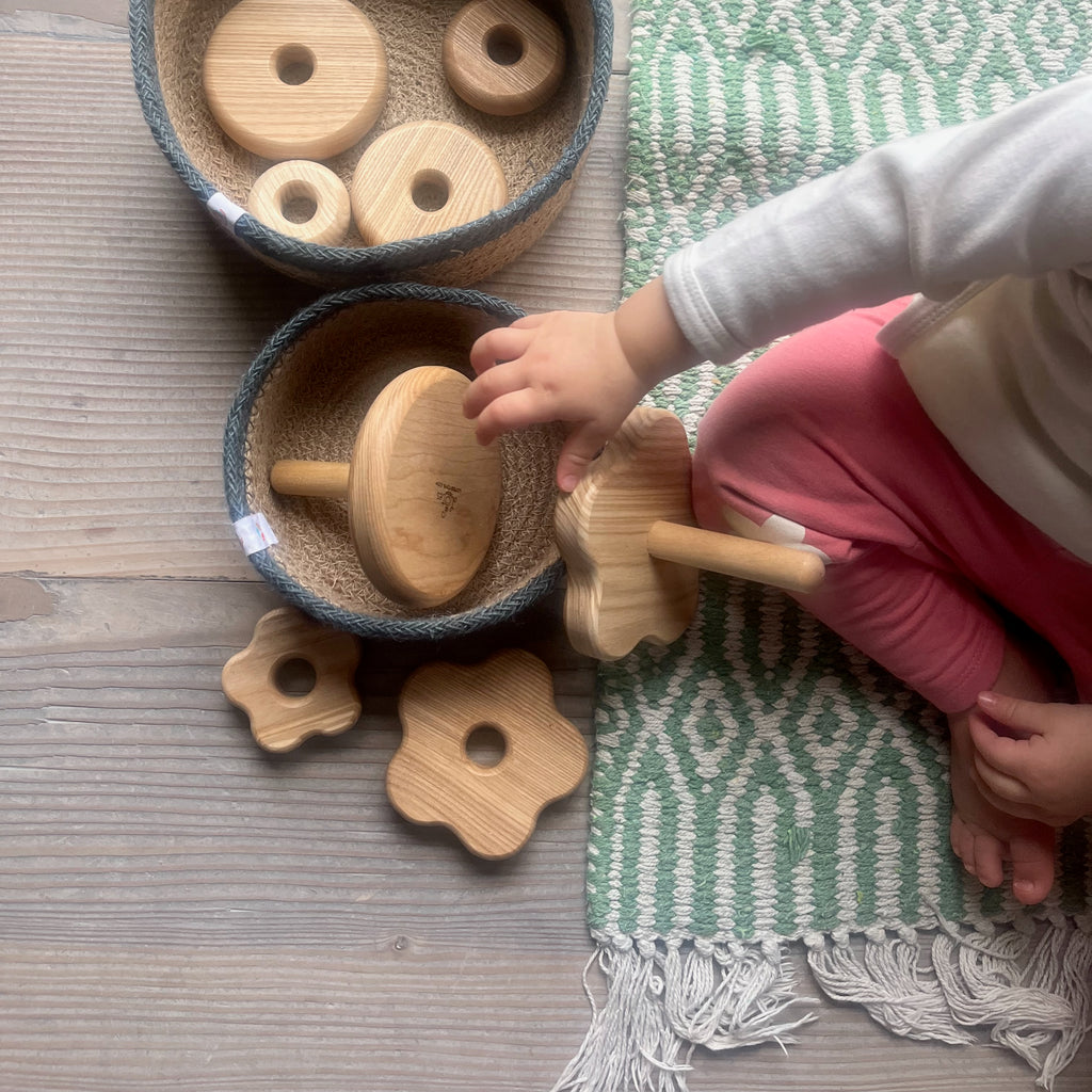 Die dicken Holzscheiben in Blumenform greifen sich ganz weich und geschmeidig an. Alleine das in Händen halten und begreifen der Blumen ist eine wohltuende Erfahrung. Die Ränder sind gut abgerundet und das Loch in der Mitte der Holzblumen will betastet werden. So sind die Blumen für sich alleine schon ein einladendes Material. Später will das Kind dann möglicherweise versuchen, ob eine dieser Scheiben auf die Stange passt. Oder noch eine und noch eine. Bis ein ganzer blumiger Stapelturm entstanden ist. Und vielleicht später noch, will das Kind die Scheiben der Größe nach stapeln, damit der Turm von unten nach oben immer schmäler und spitzer wird. Und wenn Stapeln nicht mehr interessant ist, dann finden die Scheiben sicher in der Bauecke - mit vielen anderen wunderbaren Bausteinen - Verwendung :-)