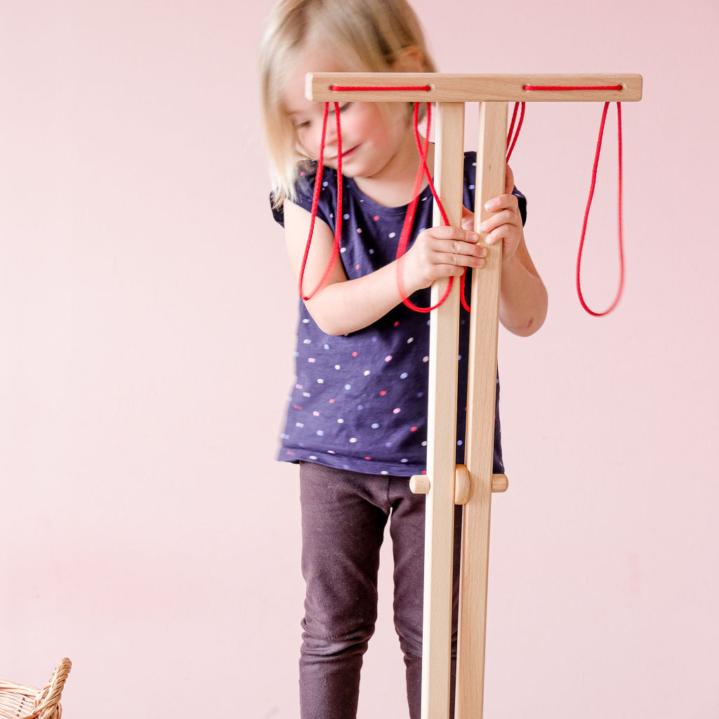 Damit Hausarbeit Freude machen kann – auch im Spiel – braucht es Materialien, die gut in der Hand liegen, robust sind und lange halten. Genau das bietet dieser liebevoll gefertigte Wäscheständer aus Holz: stabil, hochwertig verarbeitet und leicht zusammenklappbar.