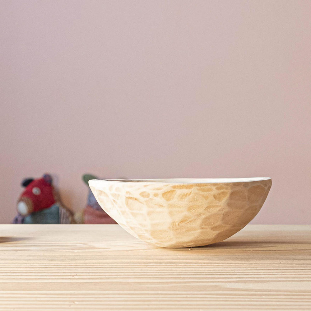 Zuerst wird mit einer Spezialhacke die grobe äußere Form des Gegenstandes aus einem Stück Holz geschlagen und danach mit einem Dechsel Schicht für Schicht ausgehöhlt. Die Oberfläche wird zum Schluss mit einem geraden Messer und einem gebogenem Schabmesser bearbeitet, das den Gegenständen den „letzten Schliff“ verleiht – was ein wunderbar passender Ausdruck für die Oberfläche der Schalen und Teller ist - denn die gleicht tatsächlich der Form eines Diamanten. Unverwechselbar schön. Schimmernd in allen hellen Puder-, Braun-, und Rose-Tönen. Jedes Teil ist ein wahres Kunstwerk – mit spürbarer Seele.